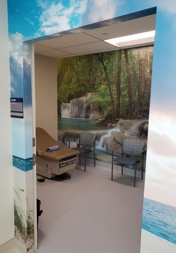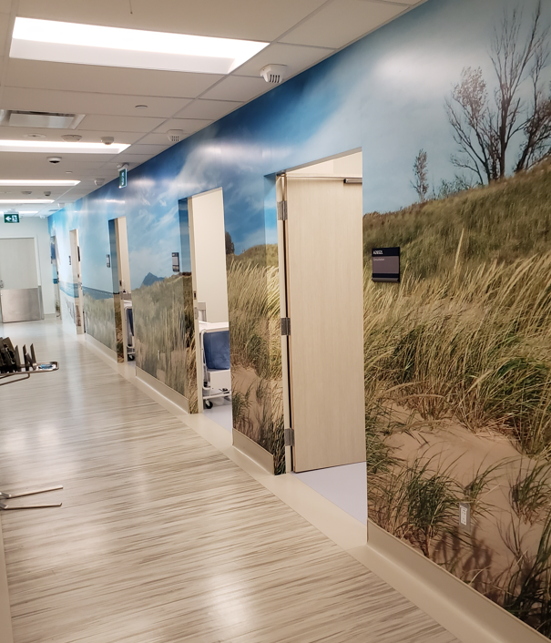 Demolition of existing gift shop & exam rooms. All new install of drywall partitions with wood doors, frames & hardware. Murals to walls, structural glass wall including film. New millwork at the gift shop & reception. Privacy curtain to all 7 new exam rooms with flooring & white rock base. Painting throughout. New door operator to public washroom & entry door. S&I new security devices, light fixtures, plumbing, HVAC, fire alarm & balancing work.