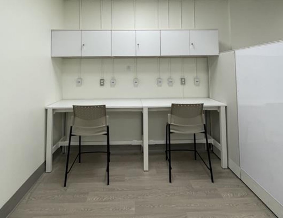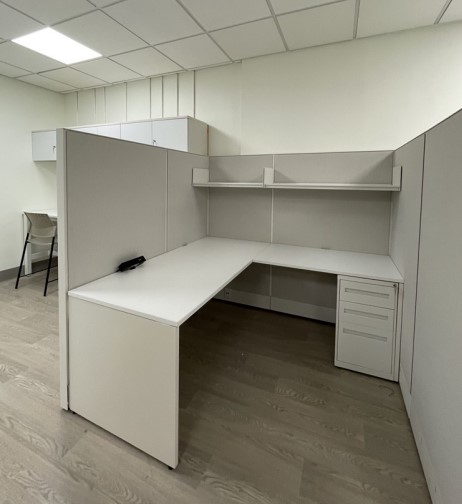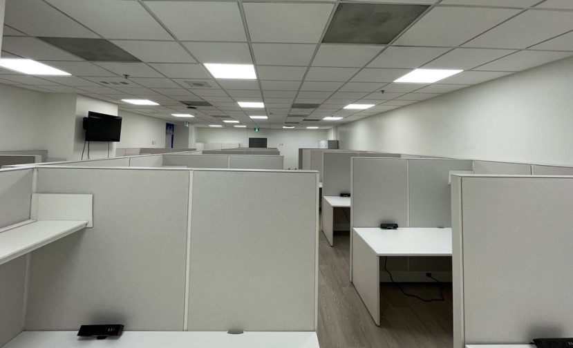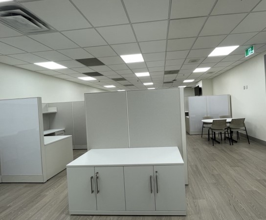 Refresh old office space by conjoining 2 adjacent rooms into main larger workspace to accommodate service operations within the Digital Health Department. Ceiling adjustments, wall repairs, installation of new flooring & update signage to reflect new department branding. Replace 13 old workstations with 14 new, space optimized workstations.